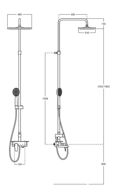 Coloana de baie-duș monocomandă din seria EVEN este destinată montajului mural și combină funcția de duș cu cea de umplere a căzii. Construcția include o repisă și permite reglarea înălțimii între 1253 și 1653 mm.