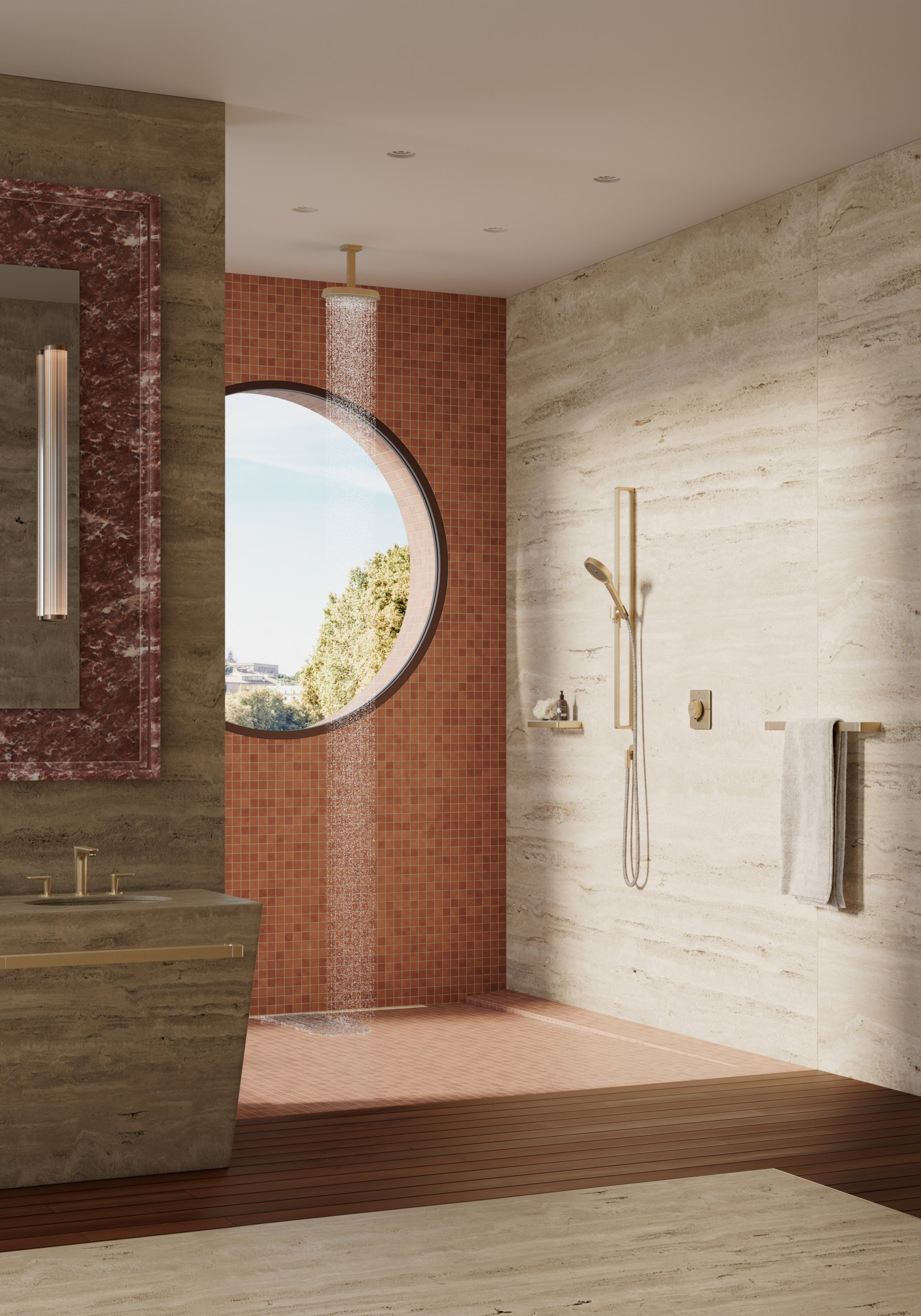 Bateria de lavoar cu montaj pe blat din colecția Axor Citterio C reprezintă o fuziune rafinată între eleganța clasică și precizia modernă. Designul său cu trei orificii și mânere de tip pârghie, decorate cu textura exclusivă „cubic cut”, oferă un control ergonomic și un aspect estetic deosebit. Tehnologia AirPower îmbogățește jetul de apă cu aer, creând picături delicate și prevenind stropirea, în timp ce funcția EcoSmart optimizează consumul de resurse. Finisajul Brushed Bronze adaugă un accent de lux durabil, fiind extrem de rezistent la coroziune și uzură zilnică.