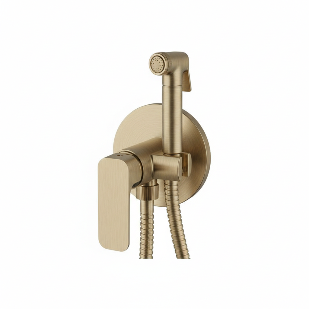 Bateria de duș igienic încastrată din colecția Tiara, cu finisaj bronz șlefuit, reprezintă o soluție rafinată și elegantă pentru igiena personală, adăugând un caracter distinctiv băilor moderne prin nuanța sa caldă și textura sofisticată. Sistemul monocomandă permite o reglare fluidă și precisă a temperaturii și a debitului de apă, în timp ce para de duș compactă este dotată cu o pârghie de activare ce asigură un control total în timpul utilizării. Finisajul bronz șlefuit (brushed bronze) oferă o rezistență ridicată la amprente și coroziune, menținând un aspect impecabil pe termen lung. Datorită montajului ascuns, toate conexiunile tehnice sunt mascate în perete, contribuind la o estetică ordonată și de lux.