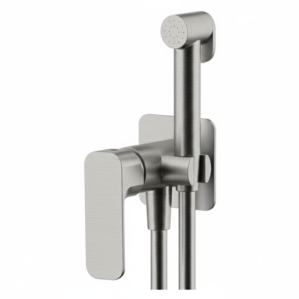 Bateria de duș igienic încastrată din colecția Tiara se distinge prin designul său pătrat și finisajul rafinat Visual Inox, oferind o estetică industrial-modernă băilor contemporane. Sistemul monocomandă permite controlul fluid al temperaturii, în timp ce para de duș prevăzută cu buton shut-off asigură o utilizare ergonomică și precisă. Montajul ascuns eliberează spațiul vizual, mascând componentele tehnice în perete pentru un aspect minimalist. Finisajul tip inox periat este special conceput pentru a ascunde urmele de apă și amprentele, menținând un aspect impecabil cu un efort minim de întreținere.