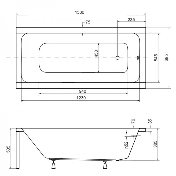 Lungimea căzii 140 cm, lățimea 70 cm, adâncimea aproximativ 39 cm; concepută pentru o persoană.