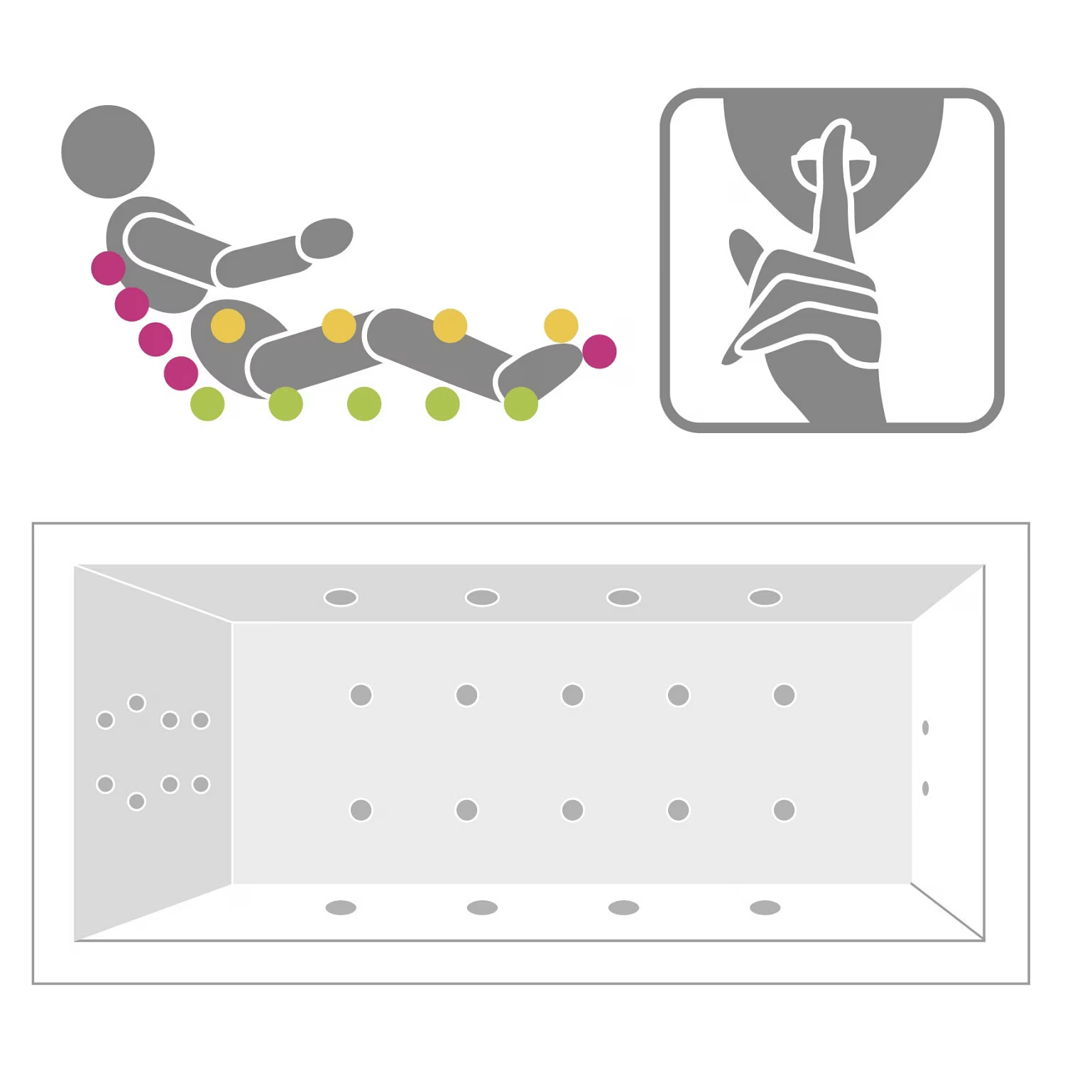 Sistemul integrează 10 jeturi în bază şi 18 jeturi laterale, control digital al intensităţii şi temperaturii apei, dimensiuni 190x90x52,5 cm, capacitate pentru două persoane.