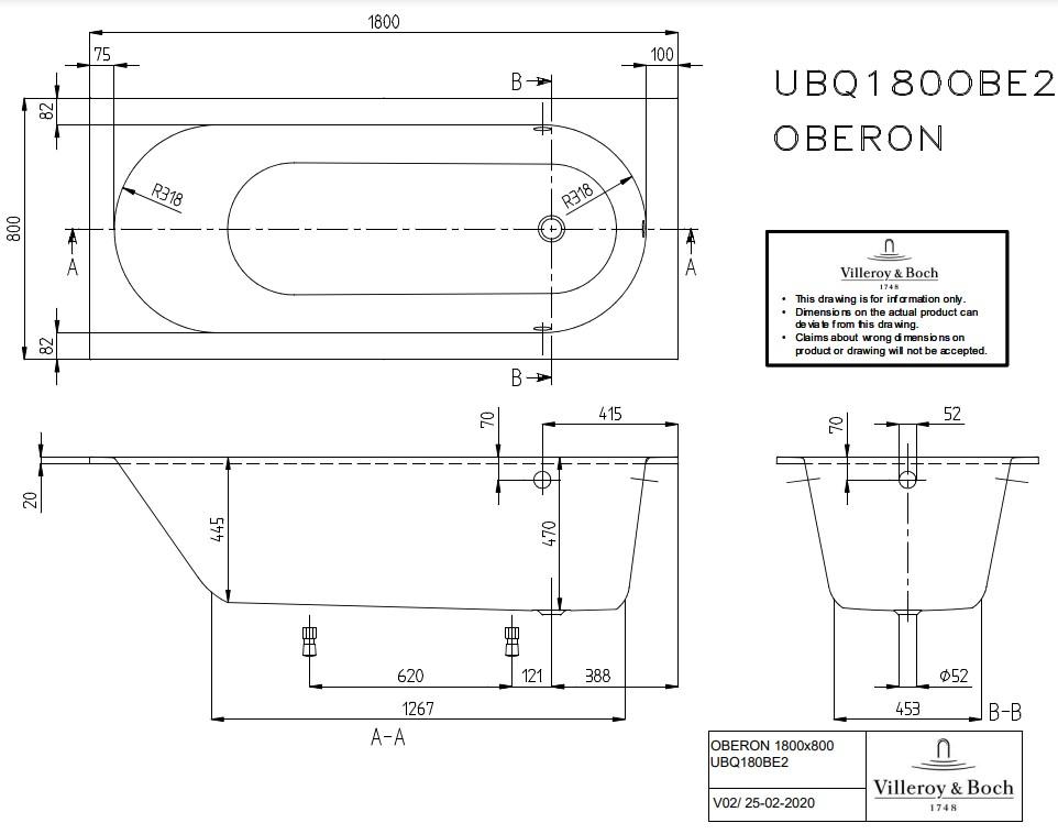 Cada dreptunghiulară montată integrat Villeroy & Boch Oberon 180x80 cm este fabricată din material Quaryl®, oferind un design contemporan şi dimensiuni compacte pentru o persoană.