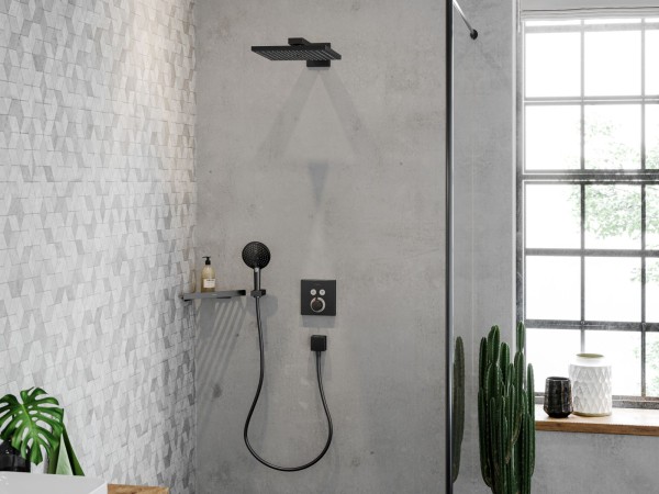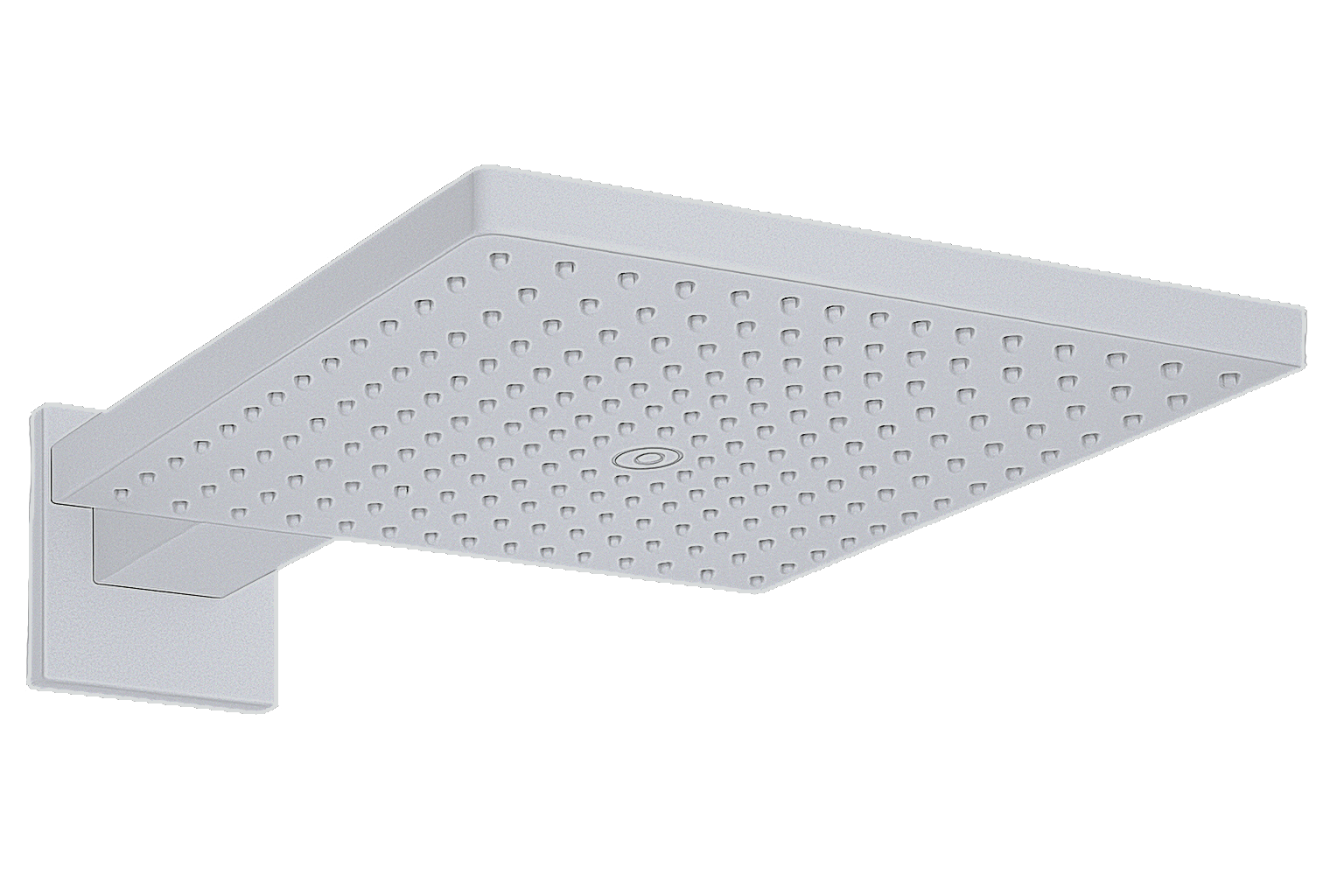 Сap de duș Hansgrohe Raindance E 300 — duş fix montat pe perete cu cap de duş metalic patrulater 300x300 mm și braț curbat de 390 mm. Dispune de jet RainAir cu picături aerate, moi și uniforme. Tehnologia EcoSmart limitează debitul la 8,3 l/min (la 3 bari), economisind apă fără a compromite calitatea dușului. Discul de pulverizare este detașabil pentru curățare ușoară, unghiul capului de duș reglabil prin articulație sferică.