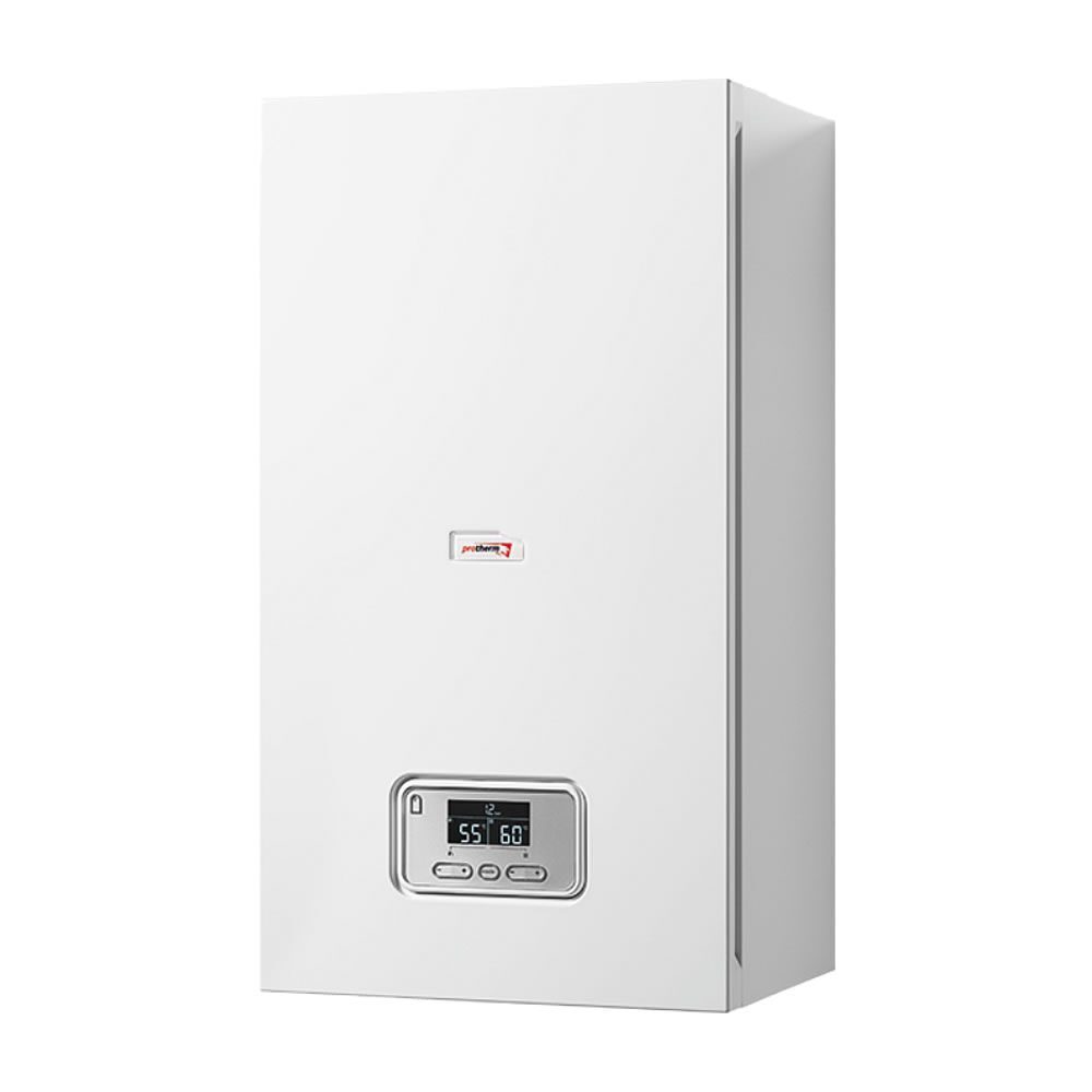 Centrală electrică de perete PROTHERM RAY 28 KE, 28 kW, proiectată pentru încălzirea spaţiilor rezidenţiale prin reţea de agent termic şi pentru alimentarea unui boiler indirect pentru apa caldă menajeră (ACM). Sistemul are modulaţie continuă 2,3–28 kW, afişaj digital, pompă integrată şi vas de expansiune încorporat (7 L). Produsul nu necesită coş de fum şi funcţionează la alimentare trifazică 3 x 400 V; grad de protecţie IP40. Încălzirea se realizează până la 85 °C, presiunea maximă de lucru 3,0 bar.