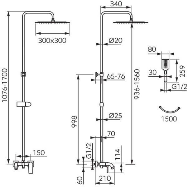 Montaj pe perete, racord excentric G 1/2" cu distanță între axe de 150 ± 20 mm. Racord superior pentru duș fix, racord inferior pentru duș de mână. Pachetul include duș fix, duș de mână, bară metalică, furtun PVC de 150 cm, baterie și elemente de fixare.