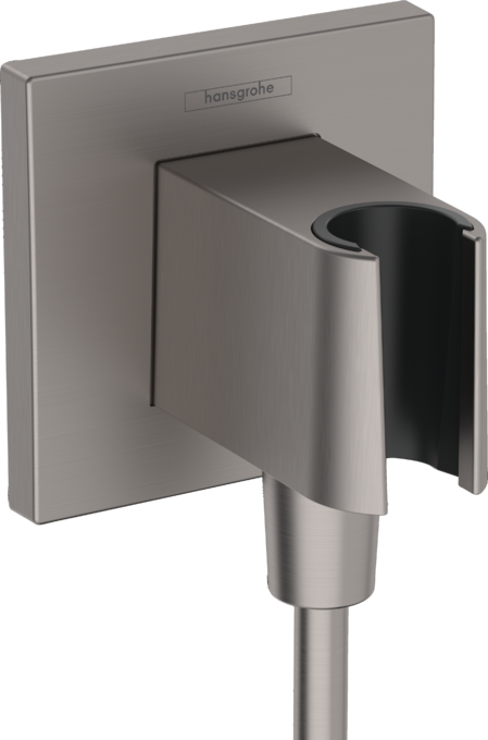 Racordul fix cu suport Hansgrohe FixFit E este destinat montajului sigur al parai de duș și conectării discrete a furtunului. Canalul intern de alimentare permite realizarea conexiunii ascunse și menține estetica minimalistă a zonei de duș. Suportul este fix, fără reglaje, cu rozetă pătrată și supapă antiretur. Finisajul negru periat protejează suprafața împotriva coroziunii și uzurii.