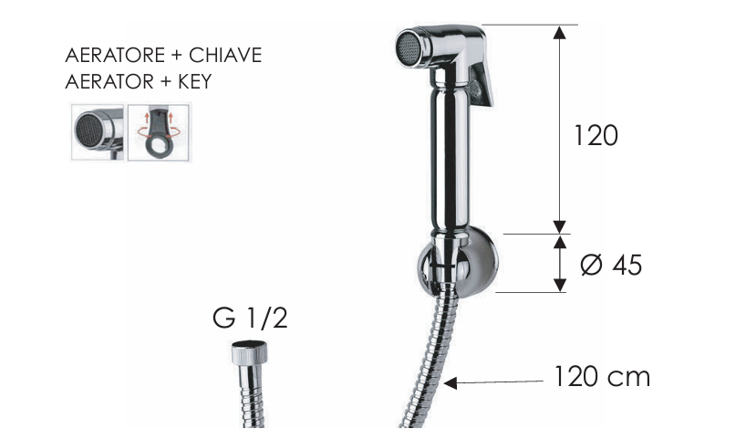 Compatibilitate și condiții de montare: se montează pe perete lângă vasul WC; conexiune standard G 1/2; compatibil cu bateriile încastrate de duș sau robinete de închidere. Recomandări de îngrijire și siguranță: curățați cu o cârpă moale și detergenți neabrazivi; nu folosiți produse pe bază de clor sau acizi; după fiecare utilizare opriți alimentarea cu apă din baterie pentru a elibera presiunea.