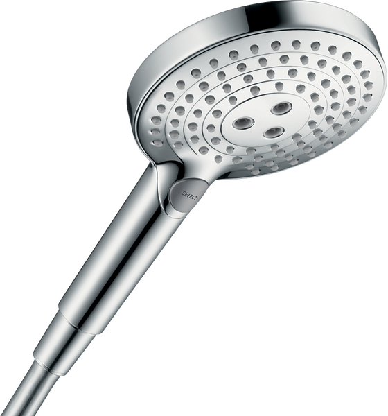 Para de duş Hansgrohe Raindance Select S 120 este o duş-mână compactă cu diametrul de 125 mm şi racord standard G1/2". Aceasta oferă trei tipuri de jet — RainAir (picături aerisite, blânde), Rain (jet abundent, dens) şi Whirl (jet rotativ-masaj), oferind flexibilitate: de la un duş relaxant până la clătirea eficientă a părului sau masaj. Debit maxim 8,5 l/min la 3 bar, funcţionare stabilă de la 1,5 bar — compatibilă cu majoritatea instalaţiilor domestice şi cu boilere instantanee. În set este inclusă o sită-filtru, iar capul duşului are disc din plastic cu suprafaţă QuickClean pentru curăţare simplă.