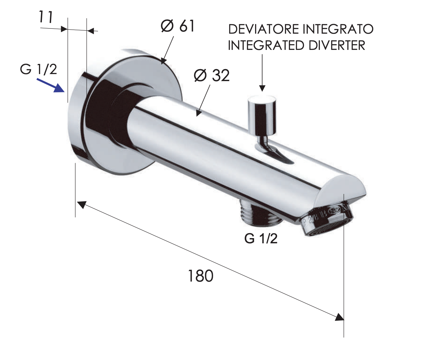 Pipa pentru cadă/duș cu divertor integrat se va privi armonios în orice cameră de baie, datorită designului ei laconic și modern. Fabricat din alamă sanitară din înaltă calitate și cu finisaj cromat acest produs va avea o durată de exploatare mai mare decât la analogiile prezentate pe piață. Acest produs este disponibil pentru comenzi online cu livrare sau cu posibilitatea de a fi ridicat din magazin. Alegeți eleganța și calitatea produselor Daniel Rubinetterie la un preț foarte avantajos.
