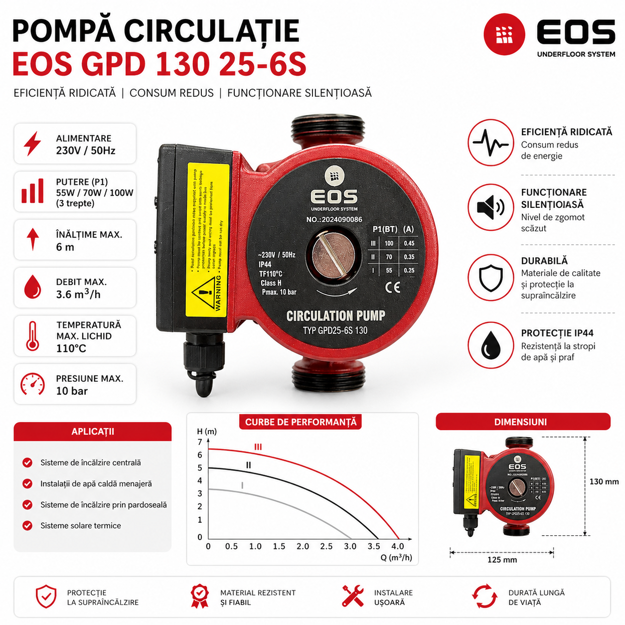 🔥 Circulatie eficienta si constanta – debit de pana la ~3–3,5 m³/h si Hmax 6 m