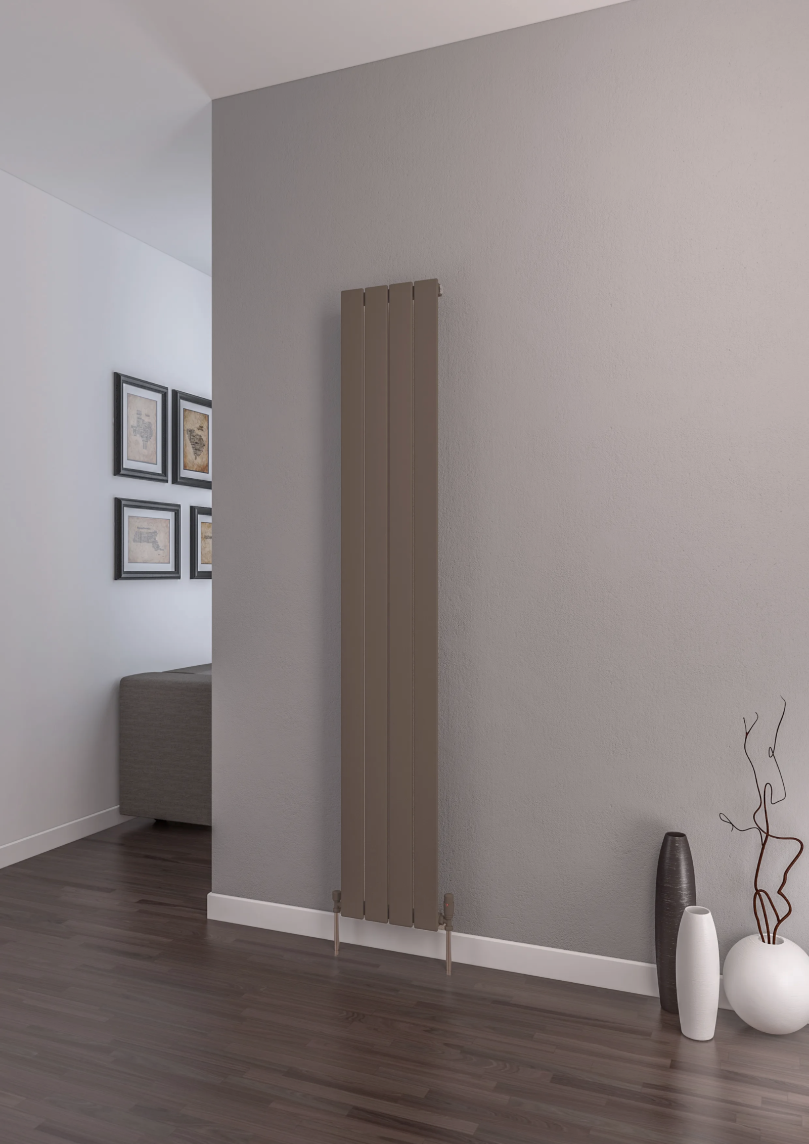 Radiator de baie din oțel, dimensiuni 295x1800 mm, finisaj capucino. Se montează pe perete și oferă o încălzire eficientă a băii, fiind suficient de înalt pentru a distribui căldura pe verticală și a ajuta la uscarea prosoapelor. Modelul funcționează pe apă (agent termic) și poate fi echipat ulterior cu un TEN electric compatibil pentru a obține un model combinat (apă + electric).