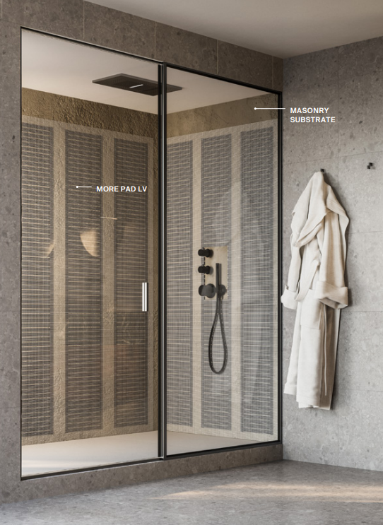 MORE PAD LV este un kit electric de încălzire radiantă invizibilă, conceput pentru pereții din cabina de duș / zona tip calidarium. Sistemul se integrează în structura peretelui (sub finisaj), oferind confort termic rapid, uniform și un aspect curat, fără radiatoare sau elemente la vedere.