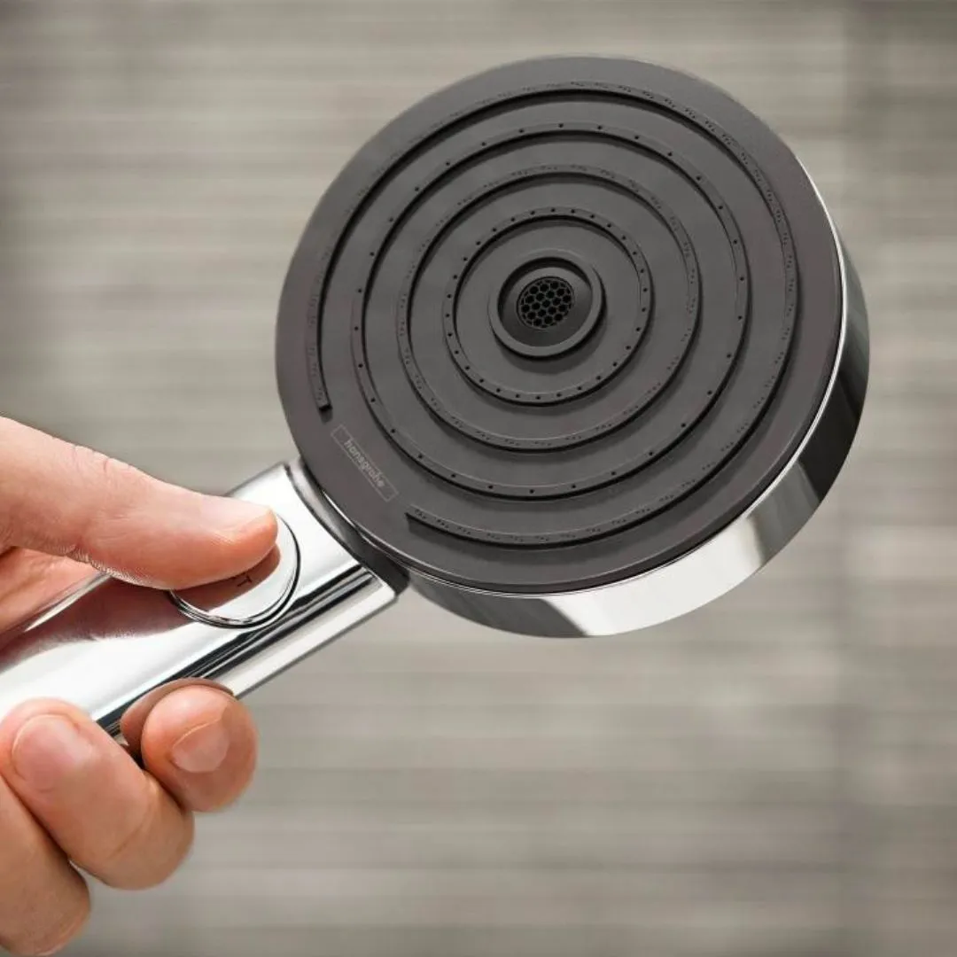 Setul de duş Pulsify S oferă o soluţie completă pentru instalarea pe perete, incluzând para de duş, bară de duş, furtun şi suport reglabil. Capul de duş are diametrul de 105 mm şi oferă trei tipuri de jet — PowderRain, IntenseRain şi jet de masaj — cu comutare prin butonul Select, pentru adaptarea fluxului la preferinţele utilizatorului. Bara cu diametrul de 22 mm şi lungimea de 669 mm se montează pe perete cu suporturi adecvate. Debit maxim la 3 bar este 11,4 l/min.