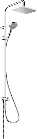 Sistemul de duș Hansgrohe Vernis Shape este destinat montajului extern și asigură reglarea precisă a temperaturii și a debitului de apă. Sistemul include duș fix Vernis Shape 230 1jet, duș de mână cu două tipuri de jet (Rain, IntenseRain), bară cu diametrul de 19 mm și suport pentru duș de 426 mm, reglabil pe înălțime.