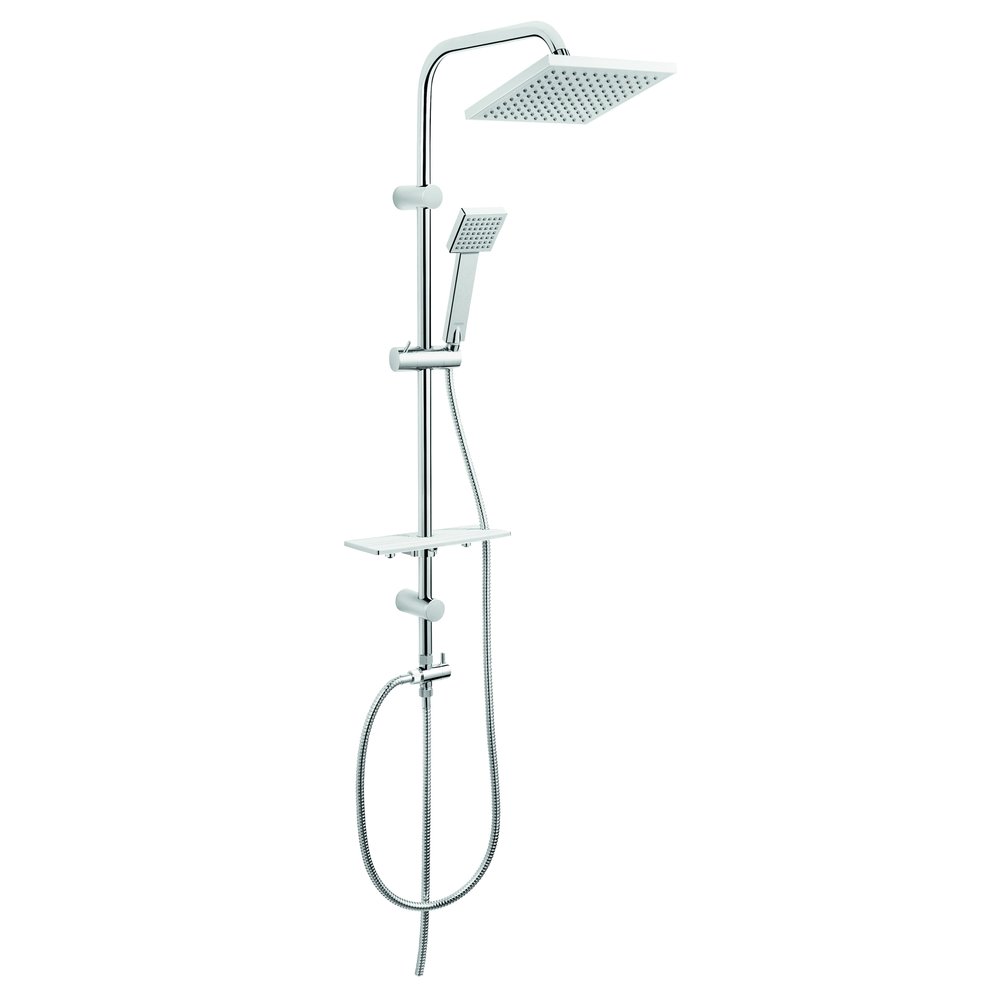 Setul de duș manual Ferro SQUERTO LUX este o soluție modernă pentru baie, incluzând cap pătrat de duș 20x20 cm, para mobilă cu o funcție, furtun de 150 cm, suport reglabil și etajeră pentru produse cosmetice.