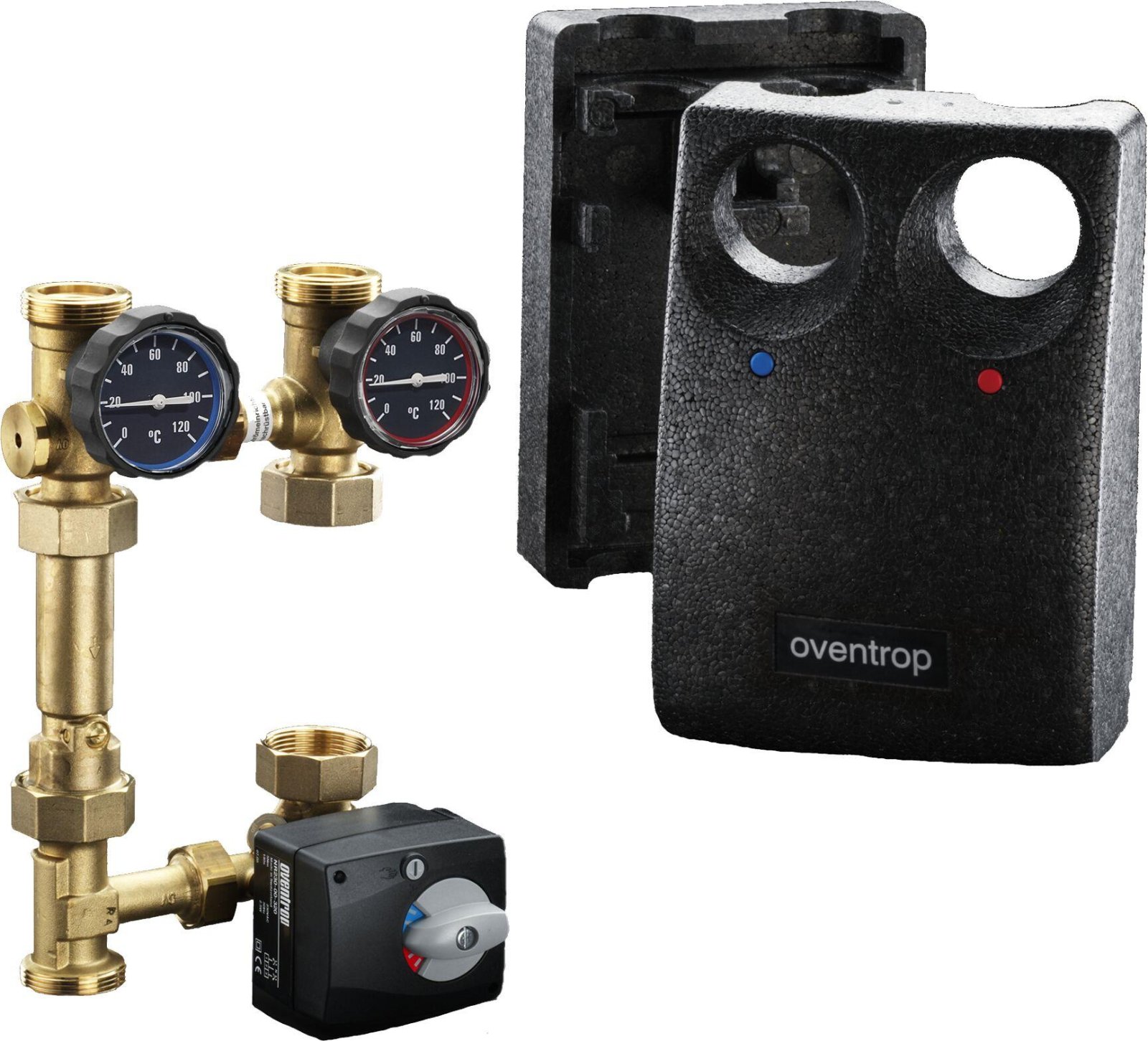 Compus din: - dispozitiv de izolare fără baipas cu 2 robineți sferici și 2 termometre - țeavă de legătură cu ventil de sens - ventil de amestec cu 3 căi și servomotor - izolație