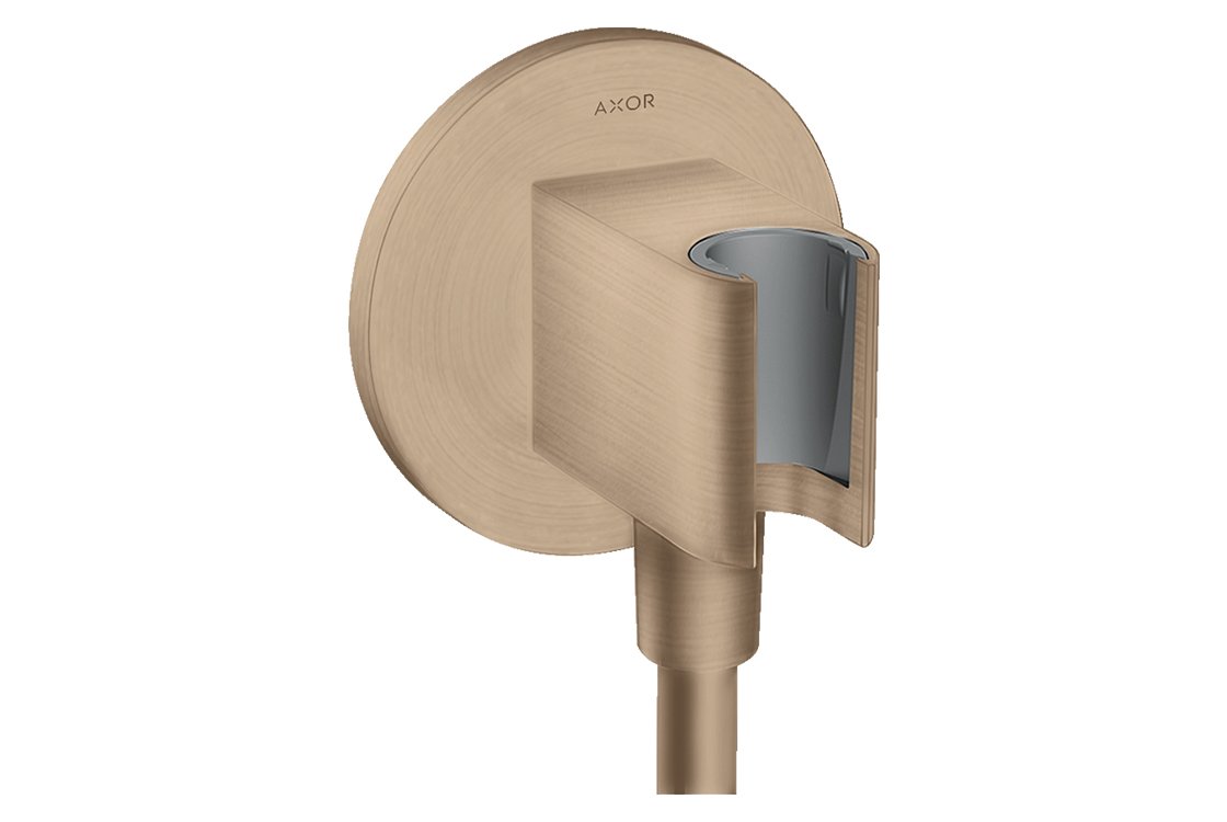 Conexiune de perete cu suport pentru para de duș Axor ShowerSolutions este concepută pentru o finisare ordonată și funcțională a zonei de duș, combinând punctul de alimentare cu apă și suportul fix pentru furtun și para de duș într-un singur corp. Construcția metalică cu canal intern de alimentare din plastic asigură durabilitate și funcționare fiabilă. Conexiunea pentru furtun cu piuliță conică și racord standard G 1/2" este compatibilă cu majoritatea furtunurilor de duș și a perelor de duș. Suplimentar, un supapă de reținere integrată previne fluxul invers de apă și menține funcționarea stabilă a sistemului. Finisajul Brushed Red Gold evidențiază designul modern și este rezistent la uzură în utilizarea frecventă.