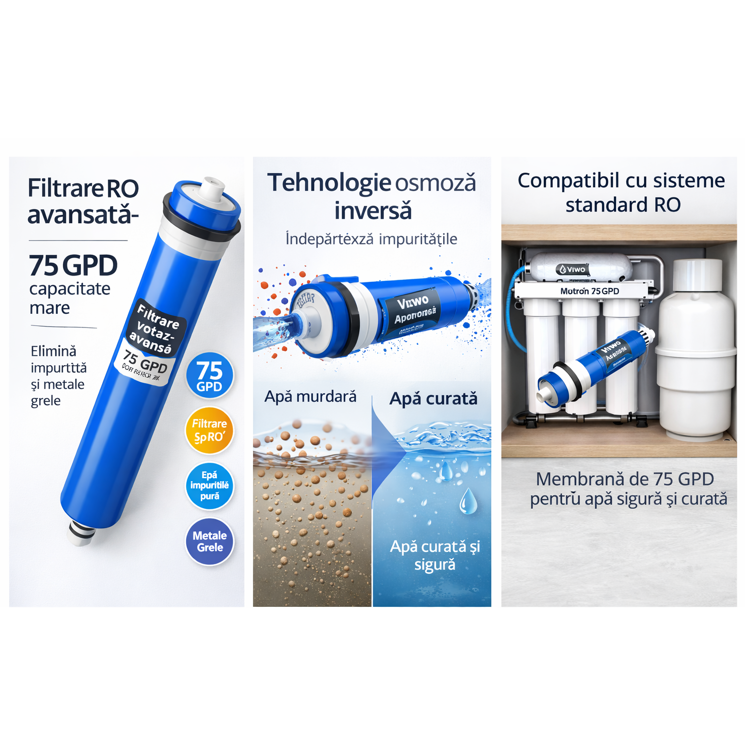 p>Membrana osmoza inversa Votron 75 GPD VIWO filtru RO,"Membrana de capacitate mare pentru apa potabila pura, filtrare avansata RO, capacitate pana la 75 GPD, potrivita pentru apartamente si case."