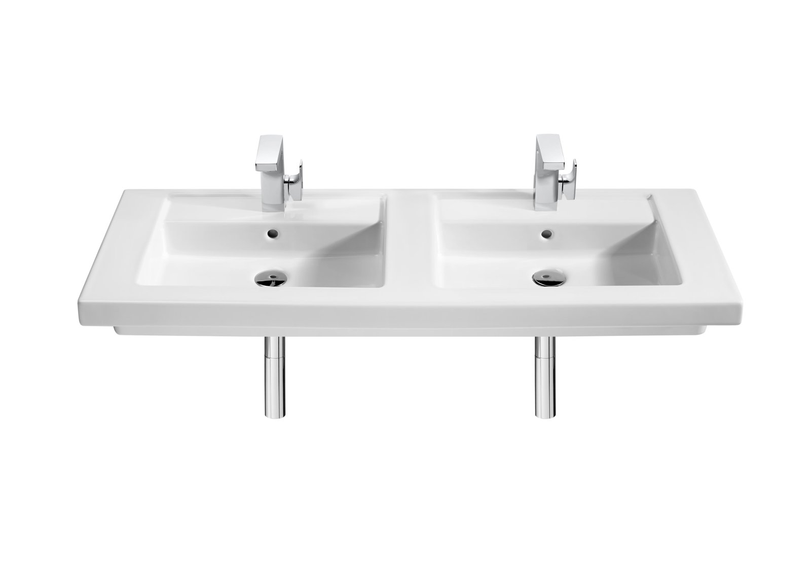 Lavoarul suspendat dublu ROCA Prisma este proiectat pentru montaj pe perete sau împreună cu mobilier, oferind o zonă de spălare practică pentru doi utilizatori. Realizat din ceramică de tip vitreous china cu finisaj lucios alb, produsul este ușor de întreținut și curățat. Dimensiunile 1200x450x130 mm și cele două orificii centrale pentru baterii îl fac o soluție versatilă pentru băi familiale și spații publice.