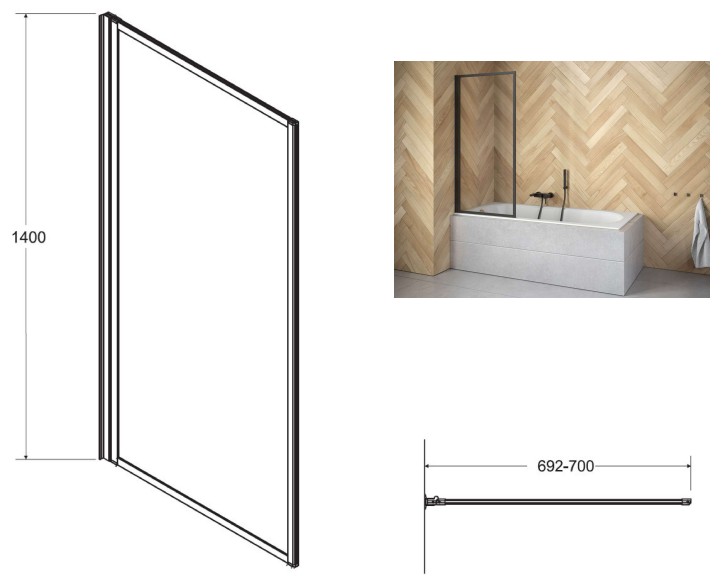 Paravan de baie pentru cada, cu o singură cercevea, destinat protejării băii împotriva stropirii apei în timpul dușului. Panoul este realizat din sticlă securizată transparentă cu grosimea de 4 mm, ceea ce asigură rezistență și siguranță adecvată. Profilul este din aluminiu cu finisaj mat negru, oferind un aspect discret, modern și ușor de integrat în decorul băii. Construcția permite montaj universal - atât pe partea dreaptă, cât și pe partea stângă; reglajul la perete compensează eventualele denivelări ale suprafeței. Dimensiunea 70x140 cm este compatibilă cu majoritatea căzilor standard.