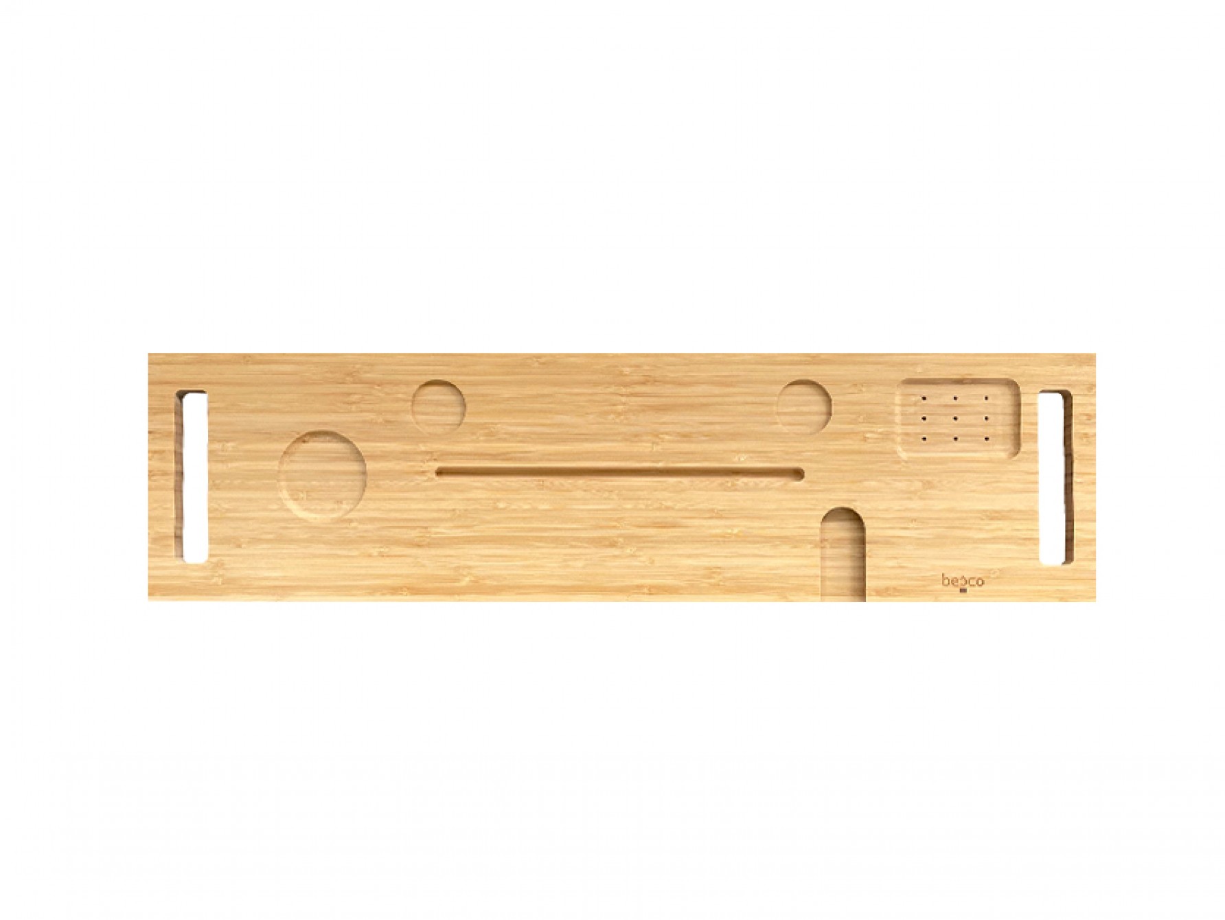 Poliță pentru cadă realizată din bambus, destinată a fi așezată pe marginea căzii. Dimensiuni: 850x220 mm. Polița oferă un spațiu convenabil pentru cosmetice, accesorii de baie sau alte obiecte ușoare, în timpul băii. Material: bambus natural, tratat pentru rezistență la umezeală și zgârieturi.