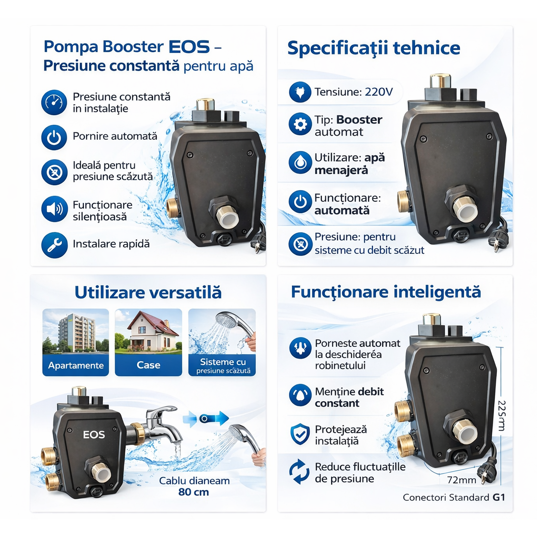 Pompa de ridicare presiune Booster EOS este solutia ideala pentru locuintele unde presiunea apei din retea este insuficienta. Aceasta pompa booster creste presiunea apei din instalatie si asigura un debit constant pentru robinete, dus, masina de spalat sau sisteme de filtrare.
