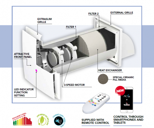 Datorită schimbătorului de căldură ceramic cu structură tip fagure, dispozitivul atinge o eficiență de recuperare a căldurii de până la 90%, contribuind semnificativ la reducerea costurilor energetice.