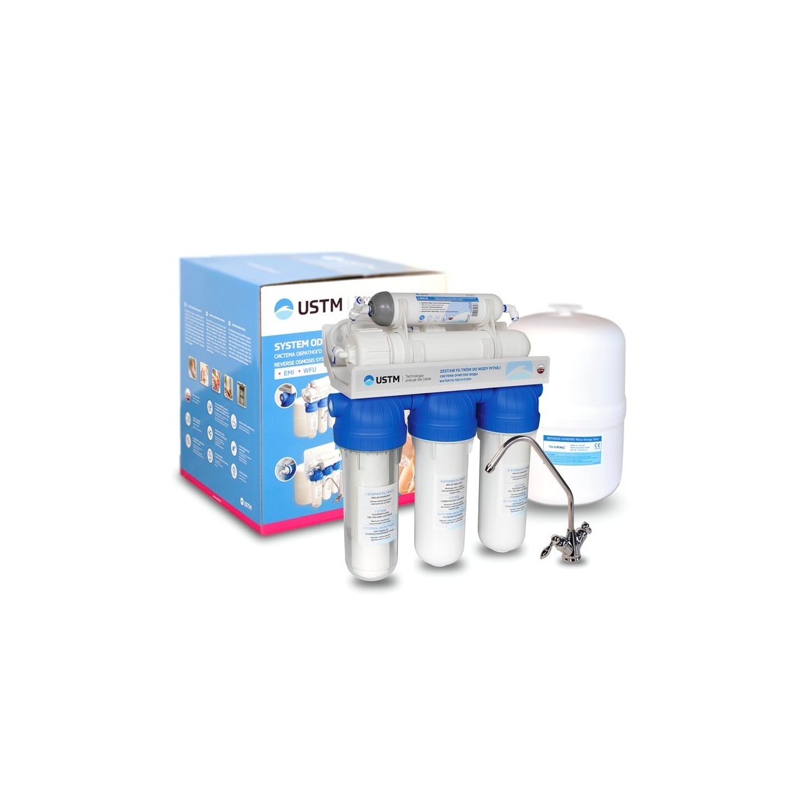 Sistemul de osmoză inversă USTM RO-6 EMI este un filtru de apă cu 6 etape de purificare, conceput pentru a oferi apă potabilă de înaltă calitate, care nu doar este curățată de impurități, dar și re-mineralizată. Acest sistem, adesea instalat sub chiuvetă, folosește o combinație de filtre pentru a elimina contaminanții, inclusiv sedimentele, clorul, metalele grele și bacteriile, și adaugă minerale benefice înapoi în apă.