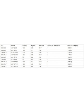 Un vas de expansiune este un element care asigură funcționarea sigură a circuitului de tip închis dintr-un sistem de încălzire. Elementele de bază ale unui vas de expansiune sunt bacul metalic și nu obligator, dar recomandabil, membrana de cauciuc, care asigură o difuzie minimă a aerului din perna de aer în sistemul hidraulic. Produsul propus spre achiziție este un vas din categoria ustensiilor plate, compacte, iar rezervorul are o capacitate de 10 litri. Acest produs poate fi achiziționat online cu livrare.